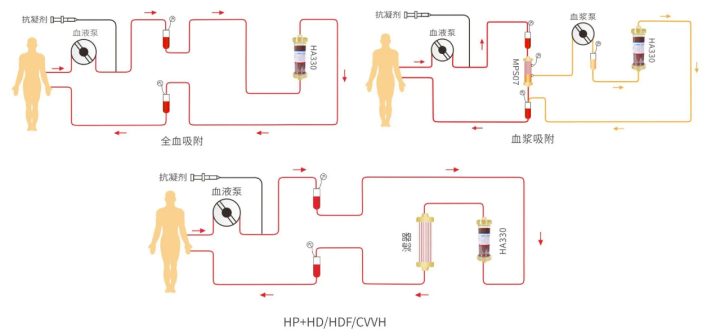 重症患者机体受到感染之后,炎性反应呈级联式放大,而人体为对抗炎症反应而形成的代偿性反应综合征,一旦患者发生全身性炎性反应与代偿性抗炎反应紊乱,可以导致其体内的环境稳态被破坏,出现组织损伤,最终出现多种器官的功能衰竭[1]。710公海寰宇公司针对不同类型危重症患者提供吸附解决方案,710公海寰宇HA一次性血液灌流器,原研经典,广谱吸附,有效清除以炎症介质为代表的中大分子,可用于脓毒症[2-3]、重症急性胰腺炎(SAP)[4-5]、急性呼吸窘迫综合征(ARDS)[6-7]等炎症因子相关性疾病及心外科手术患者[8];CA330细胞因子吸附柱,中国首个获批医疗器械注册证的细胞因子吸附类产品,专用于脓毒症患者炎症早期或细胞因子风暴期。血液吸附危重症领域治疗模式多样,临床上可以根据实际情况单独灌流使用,也可与其他血液净化模式联合使用,如HP+HD/HDF/CVVH、PFAD/CPFA[17]、(PFAD-HD)/ CPFA-CRRT[17]、HP+CPB、HP+ECMO,进行全血或者血浆灌流治疗。